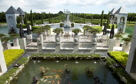 Chateau Artisan is one-of-a-kind castle positioned in beautiful settings, in the middle of a private lake surrounded by regal gardens which create utter seclusion. The chateau follows the archetypal of medieval castles, accessed via wrought iron gates with huge bronze Griffins anchored on either side; a long tree-lined gravel drive winds past the glorious views of the surrounding landscape and leads to a striking obelisk in the center of the driveway. Set on 14 acres in Miami, Florida, the residence enjoys a dramatic setting, appearing as if it is afloat on the surrounding lake. A coral stone labyrinth with rose garden further complement the fairy-tale like surroundings of this remarkable estate.