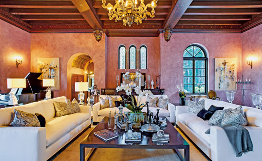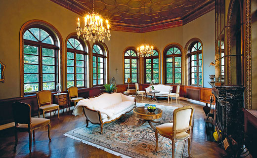 Villa Lauriston is approached by a long sweeping lane that passes between tall stands of redwoods and peaceful streams. The main house, with some 30 rooms, is introduced by a deep, broad lawn accented with many carved-stone figures. A formal arrival court large enough for a host of dignitaries makes a dramatic first impression. Beyond, granite steps pass through antique wrought-iron gates to massive wooden sliding doors that open to the grand foyer.