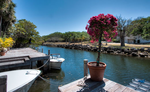 Lushly landscaped with magnificent oaks, palms, and orchids, this tropical estate sets the stage for unforgettable gatherings. A heated pool, patio, cabana, and poolside game and party room are among the many outdoor entertaining facilities, as well as 130 linear feet of ipé-planked dock with a private boat slip and floating dock. Visitors may be accommodated in a two-bedroom, two-bath carriage house with a kitchen. The garage conveniently holds six cars. Engineered to withstand severe tropical weather conditions, the property is equipped with a generator capable of running the entire compound off the grid for up to two weeks. Peace of mind is provided by the community’s gated and manned entry, private guards, and a home security system.